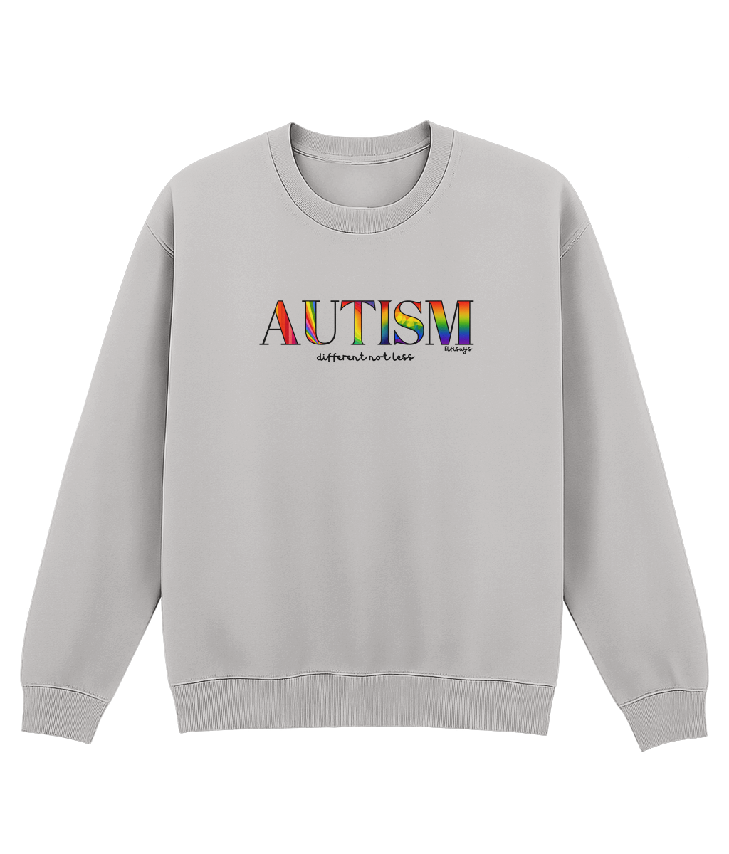 ELFI SAYS AUTISM sweatshirt with “different not less” message — a comfortable, empowering statement celebrating neurodiversity.