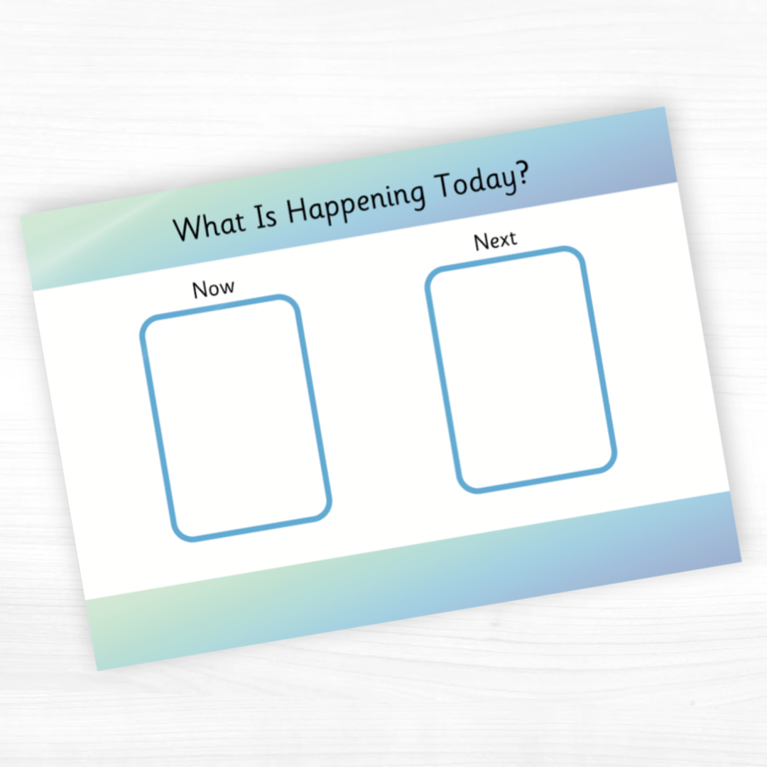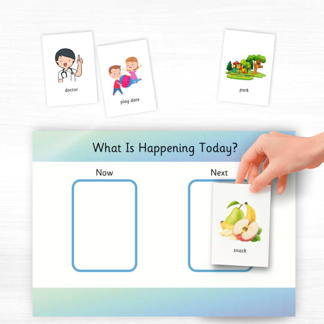 Now and next board with 35 flashcards which can also be used independently from the board.