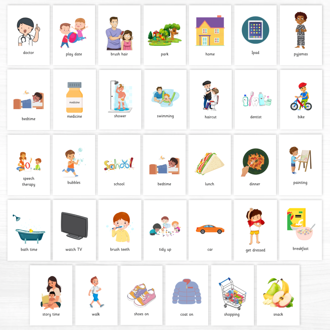 bedtime, brush teeth , park, home, school, snack, shopping, play date, brush hair, bath time, wash hands, toilet, story time, dinner, lunch, breakfast, pyjamas, get dressed, car, tidy up, coat on, shoes on, walk, watch TV, painting, iPad, bubbles, bike, doctor, dentist, haircut, swimming, shower, medicine, speech therapy.